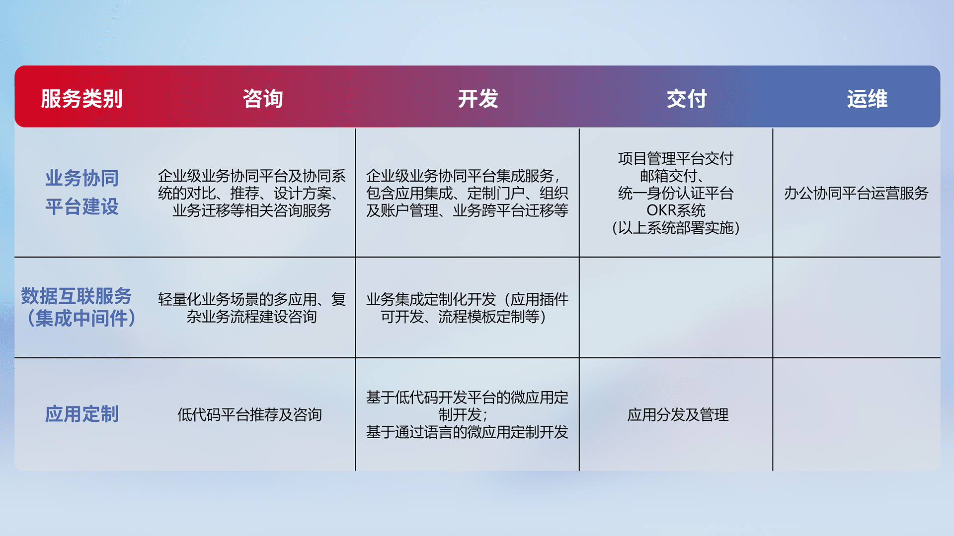 针对钉钉、、、、企微、、、、IDaas等平台级产品提供产品的规划、、方案、、、交付、、、、定制化开发等服务,,,实现如统一协同办公、、、智能客户服务、、混合会议管理、、、智能数据查询、、、等业务场景,,,实现数字化转型。。。
